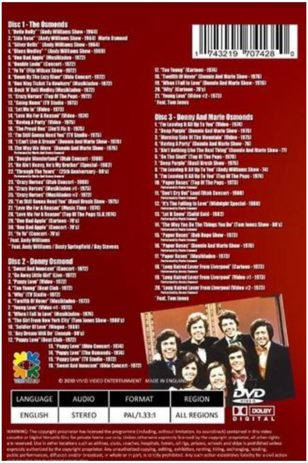 3 dvd set filled with apearances of osmonds through the years.